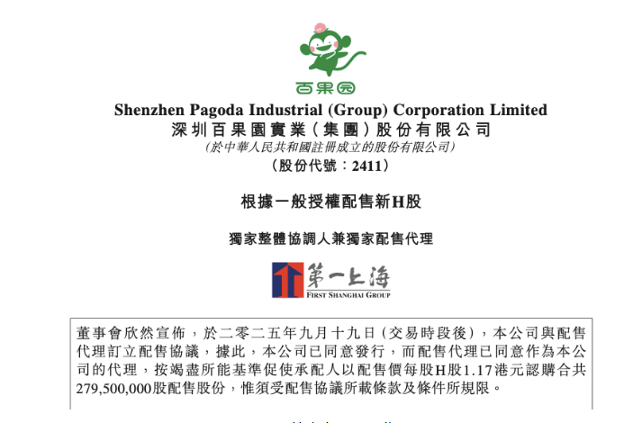 9月21日晚间,百果园集团(02411.HK)在港交所发布公告称瑞和网,公司于9月19日(交易时段后)与配售代理订立配售协议,拟以每股1.17港元的价格发行2.795亿股H股,配售股份将占经扩大后H股总数的约16.1%,占全部股份总数的约15.4%。预计此次配售所得款项净额约3.25亿港元。